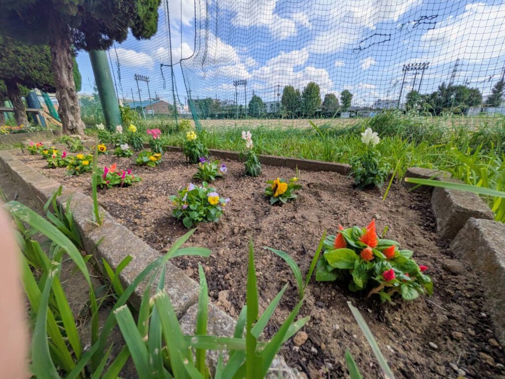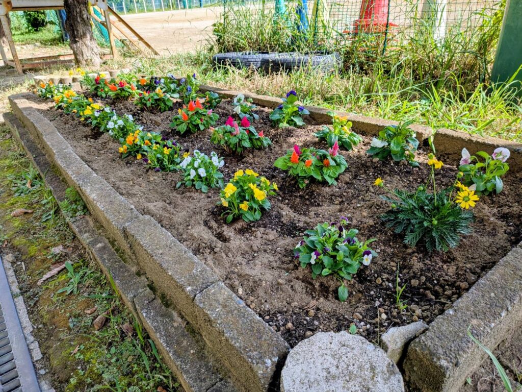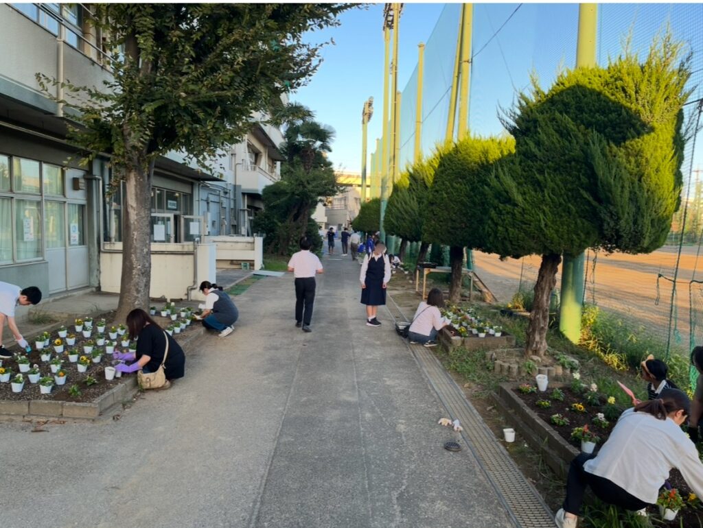 パンジーやビオラなど、これからの季節を彩る花々を植えた花壇は色とりどりに明るくなり、登下校の際に通る生徒のみなさんの目を楽しませてくれそうです。